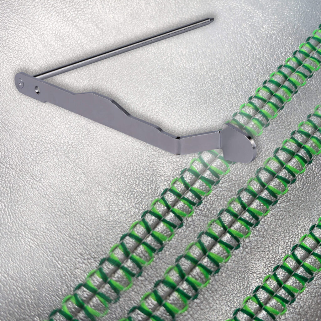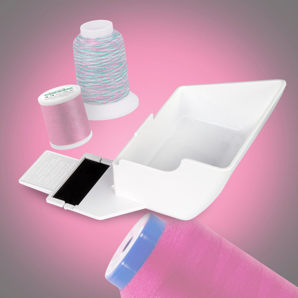 Le bac récupération des restes de fil et de tissu, qui séduit par son réceptacle à aiguilles intelligemment intégré, est une nouveauté. Cet accessoire s’adapte parfaitement à la machine et permet un flux de travail ininterrompu : le bac peut rester sur la machine pendant l’enfilage des boucleurs et toutes les molettes de réglage restent accessibles à tout moment. Cela contribue de manière significative à la simplification et à l’efficacité du processus de couture.