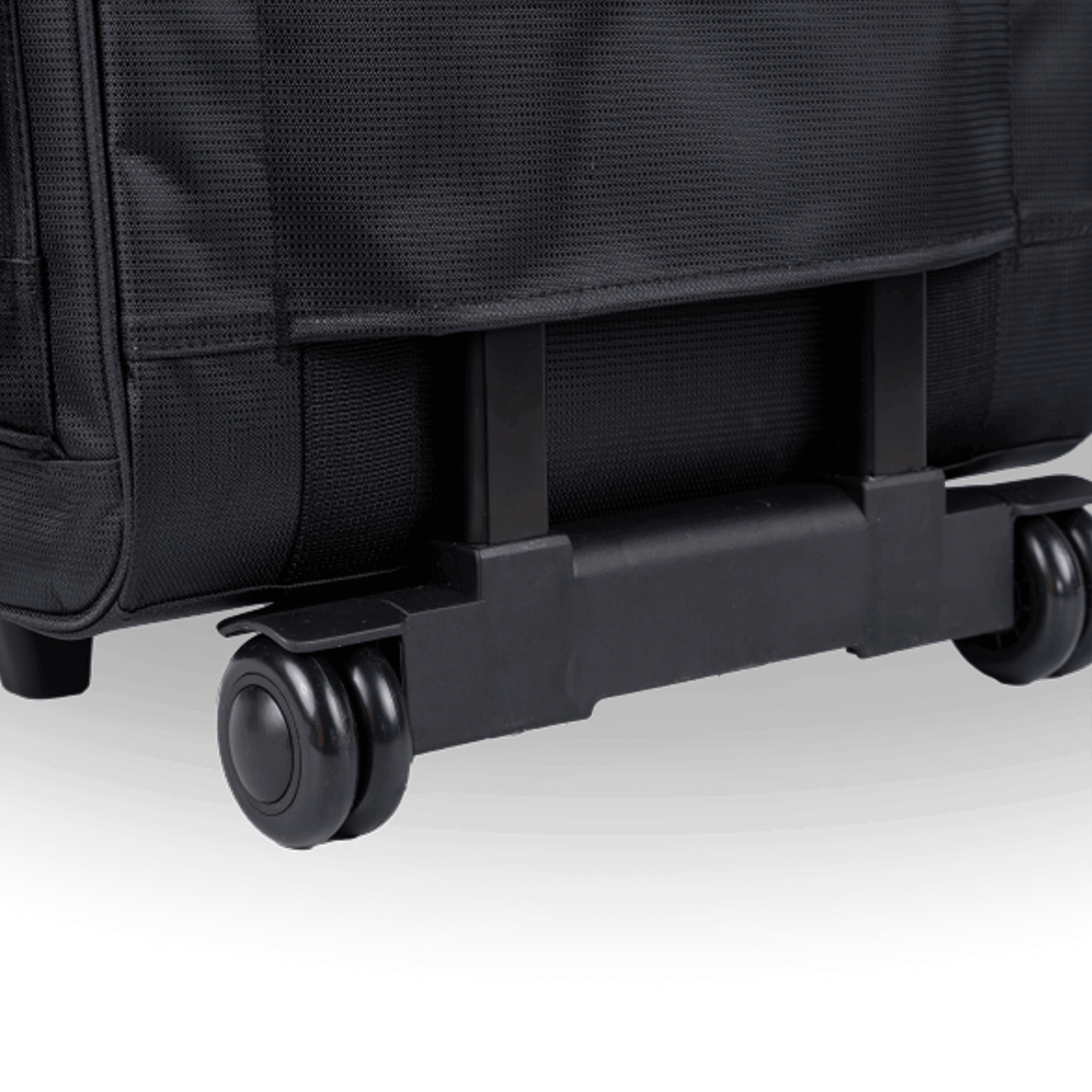 - Maniement confortable grâce aux roulettes, à la poignée télescopique à deux niveaux et aux poignées de transport latérales
